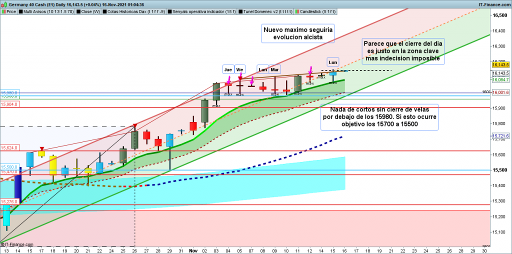 Pese a que según muchos parámetros, parece que el movimiento está en su posible fase final. De momento tenemos nuevos máximos históricos continuamente. Hoy además testeando e intentando él quiebre de la zona 16130, más directriz de máximos que coincide a estas horas con la mediana del canal si ello acaba ocurriendo, la verdad es que no hay resistencias por la parte superior hasta unos 200 puntos más arriba. Si esto se produce, quien opere estos largos, control y seguimiento con zona de corrección de un gráfico pequeño o muy pequeño hasta de 144 segundos, entrando y saliendo varias veces si hace falta para la seguridad de vuestra rentabilidad. La mejor técnica es ir ajustando los Stop Loss continuamente, ya que podría haber velas de cambio de dirección con cierta amplitud. Personalmente, como hace ya unos días, veré los toros desde la barrera, solo si entra fuerza algunas operaciones de scalping. Para la posible operativa a cortos solo con cierres de velas de gráficos grandes por debajo de los 16000.