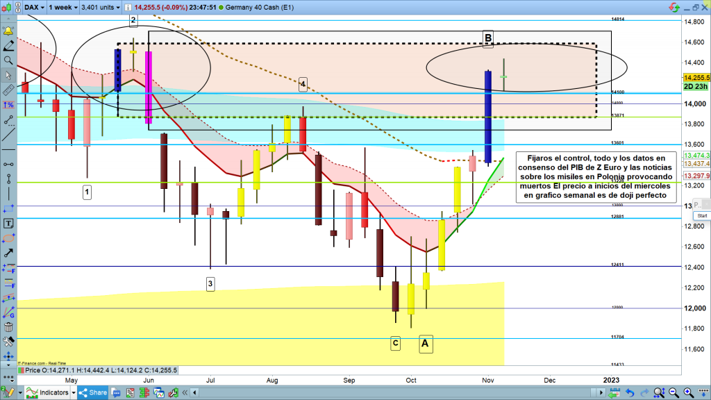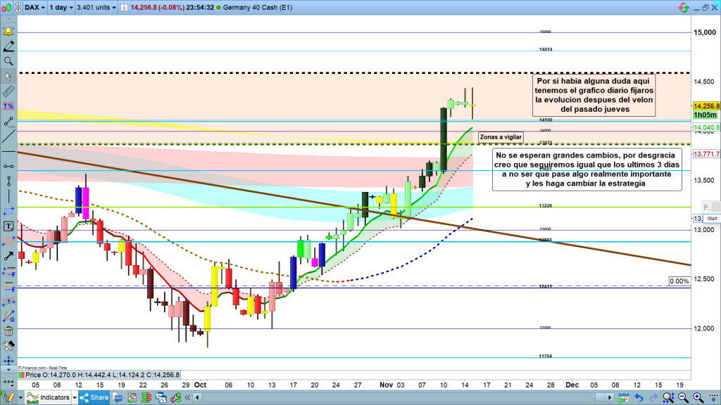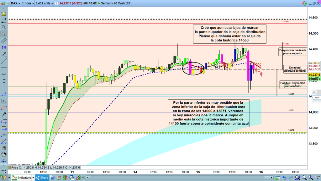En gráfico de 1 hora del dax40, detalle de la zona actual, cuidado que de momento en asiática está ligeramente bajista, importante como este a las 6 h o a las 7 h, un poco antes de preapertura, para entender el movimiento siguiente. Por abajo, si llega la cota histórica importante de 14100, actuará como fuerte soporte y posible zona de rebote. Veremos si es así y si deja pluma por la parte inferior o no, De momento, como hemos visto en gráfico, semanal, y diario, el mercado está teniendo una clara simetría, con la que la proyección hasta los 14100, es muy probable. Si tenemos pluma o movimiento con vela debajo de la zona 14100, luego deberemos pasar la proyección a la zona superior por encima de la zona ya alcanzada, como nuevo escalón para seguir motivando compras, pese a la situación general.