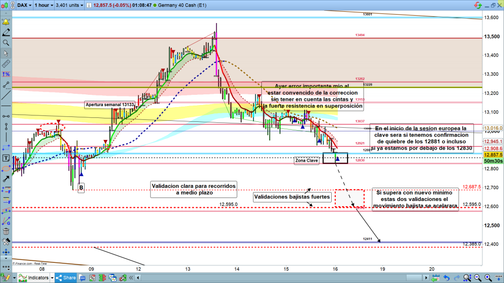 Para hoy, continuidad, en el movimiento en curso, ya llego hasta los 12881, quiebre inicial y milimetrico hasta los 12830. veremos evolución en sesión asiática e inicio de Europea. si confirma el quiebre de los 12881, de nuevo ataque ya de segundas a los 12830, y continuidad bajista. Dos zonas muy importantes de validación, con nuevos mínimos por debajo de ellas, sin duda se acelerarán los movimientos. La primera en los 12687, y la segunda en los 12595. Por debajo de estas zonas, la cota 12578, y si la quiebra y la confirma, el objetivo, la zona de la cota histórica muy importante de los 12411, la atacaríamos ya de terceras en estos últimos meses. Aunque al ser viernes podría convertirse en una buena zona de soporte y pasar el fin de semana. Muchísima suerte, muy buenos trades y muy buen fin de semana.