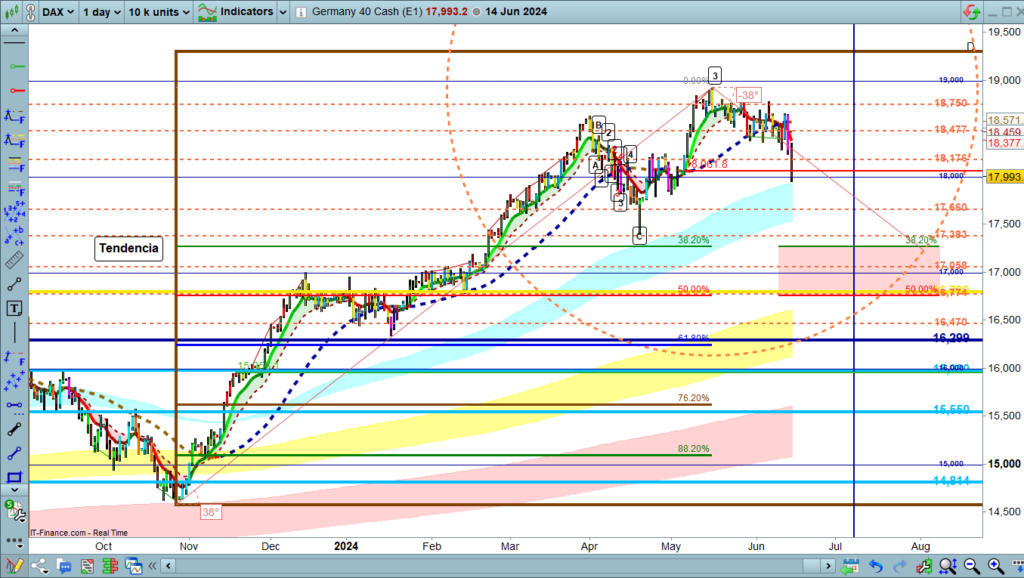 En gráfico diario del Dax 40, escenario muy claro, si la corrección es la prevista, y no hay un error en el conteo de las ondas 1 extendidas, creo que nos puede quedar aún mucho tiempo de corrección, posiblemente en un amplio lateral. La zona de corrección en retroceso, es hasta la zona entre los, 17300 y 16800, pero me temo que viniendo ya el periodo canicular, lo más probable es que no haga un retroceso importante, sino que tengamos un amplio periodo en lateral en corrección
