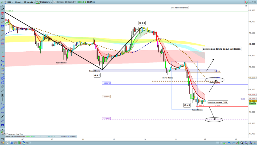 Apertura semanal sin ningún hueco en la zona de los, 17992, y ligeramente alcista en busca de la zona de corrección. Para el inicio de esta semana, es muy probable que tengamos un movimiento alcista hasta la zona de los,18100 a 18176. Si este es el movimiento que hace el precio durante el lunes, en esta zona veremos que si tenemos un nuevo impulso bajista para finalizar con una onda cinco aproximadamente en la zona de los,17800 a 17900, o, en cambio, empezamos un nuevo movimiento en forma de zigzag.