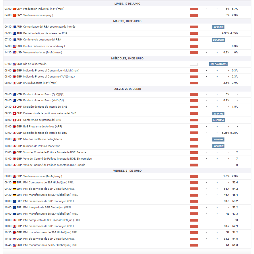 Publicado lunes 17 de junio de 2024, a las 00 h UTC. Las horas del Calendario Económico, son UTC+2.