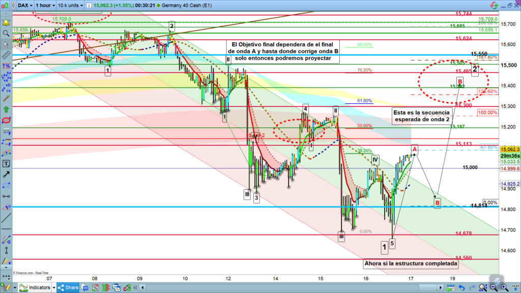 Al no tener ningún movimiento finalizado voy a intentar proyectar algunos posibles, al menos para tener una idea clara de las zonas clave más importantes a vigilar. Si la onda A, finalizara en la zona de los, 15068, la posterior onda B bajaría hasta la zona de los 14871 a 14814, dependiendo de la hora, la fuerza y la volatilidad del mercado.
