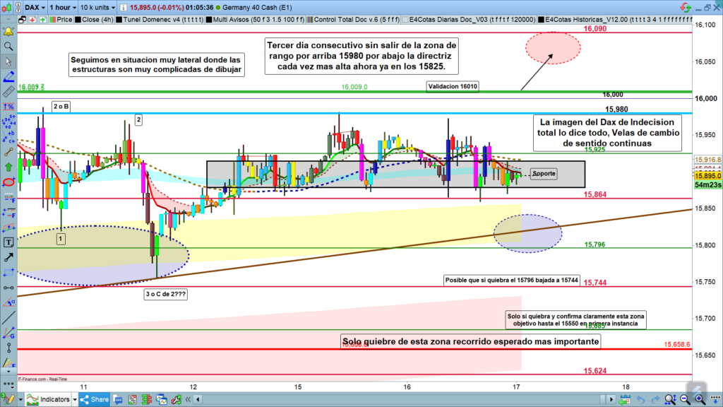 Sólo el quiebre y confirmación de quiebre de esta directriz, en los 15825, y sobre todo el quiebre y confirmación de quiebre de la cota de corto plazo en los,15796, nos llevaría hasta la zona clave importante y principal, la formada por la cota 15744, y el último mínimo, es más sería una validación muy importante en la zona de los, 15658.