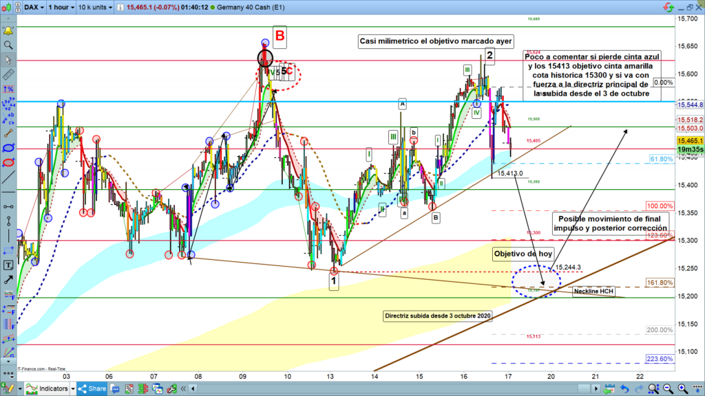 Pocas opciones más, la fuerza bajista es muy importante si llega hasta la zona de los 15300, podríamos tener una corrección de nuevo subiendo hasta los 15465, incluso a los 15500, en estructura de corrección. Por tanto, mucho cuidado a donde estamos en la preapertura europea, y sobre todo los primeros movimientos de apertura de Frankfurt, porque incluso podríamos tener movimientos en las dos direcciones, finalizar la estructura inicial bajista, y posterior corrección, hasta la zona de los 15465 a 15500. Muchísima suerte, muy buenos trades y muy buen fin de semana.