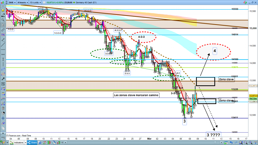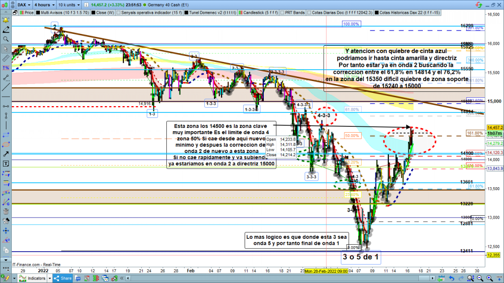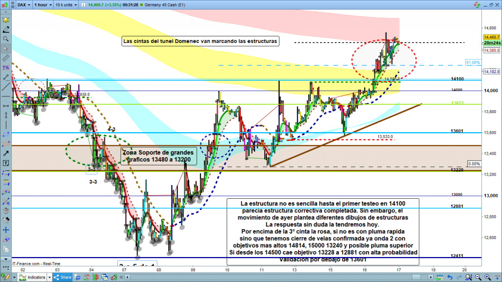 En este gráfico podemos ver la evolución hasta la parte superior de la zona proyectada. Veamos, después de este rally y la estructura interior que veremos en gráfico de 1 hora, los 14500 alcanzados son zona clave muy importante. Esta zona es aproximadamente el 50% de corrección del impulso anterior, zona normal para una onda 4 con volatilidad, entre el 38,2% al 50%.