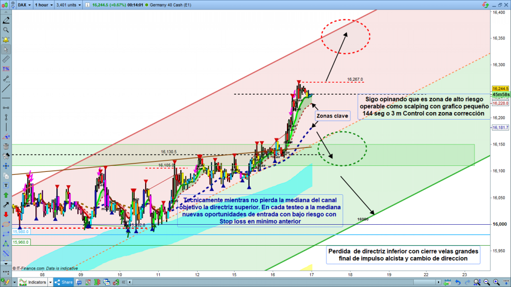 Para hoy veremos el desarrollo de sesión asiática, pero las opciones están bastante claras. Por encima de 16267, objetivo la directriz superior, en diferentes cotas dependiendo del día y la hora que la alcance. Por la parte inferior, como siempre, si pierde la zona de corrección, objetivo la Genial line. Mucha atención a la zona de la mediana, igual alcanzada por pluma sin quiebre de la Genial, o apoyo de cuerpo sobre la mediana con pluma hasta la 1ª cinta del túnel, la azul. En el caso de perdida con cierre de velas debajo de la Genial, objetivo 1ª cinta de túnel, coincidente con zona SoR ya dibujada hace un par de meses, sabiendo que sería importante cuando el precio llegara hasta ella entre los 16110 y los 16150. solo con cierre de velas por debajo de 16100, objetivo la directriz inferior del canal. Él quiebre con cierre de velas por debajo de la directriz inferior, daría por finalizado el impulso alcista con cambio de dirección. En el gráfico las opciones y zonas quedan claras para una operativa rentable. Muchísima suerte y muy buenos trades.
