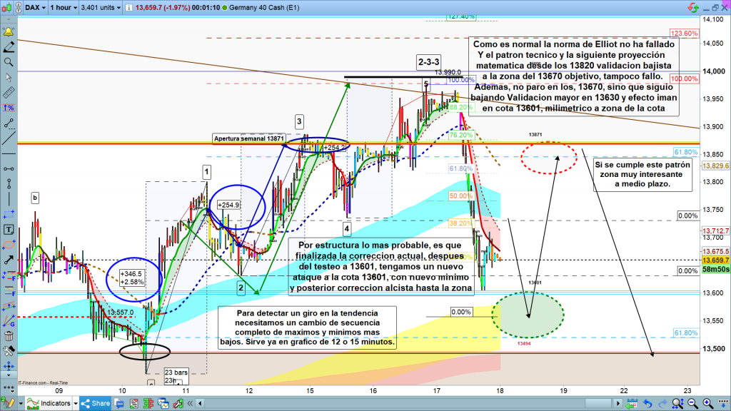 Ayer, desde la vela de la preapertura, a las 8 h, de la mañana, empieza el rally bajista, la vela de las 9 h, vela de cambio de secuencia, y la vela de las 10 h, confirmación de secuencia bajista en gráfico de 1 hora. y durante la vela de las 11 h, validación, con nuevo mínimo debajo de los 13820, y entradas por orden aconsejadas, para la proyección del objetivo hasta los 13670. Cuando llego a la zona proyectada, siguió bajando, validación mayor con mínimo debajo de los, 13630, y efecto imán hasta la zona de la cota histórica muy importante, en los 13601. Ahí, rebote y corrección menor en curso, corrección aun en curso a unos minutos del inicio de la sesión asiática.