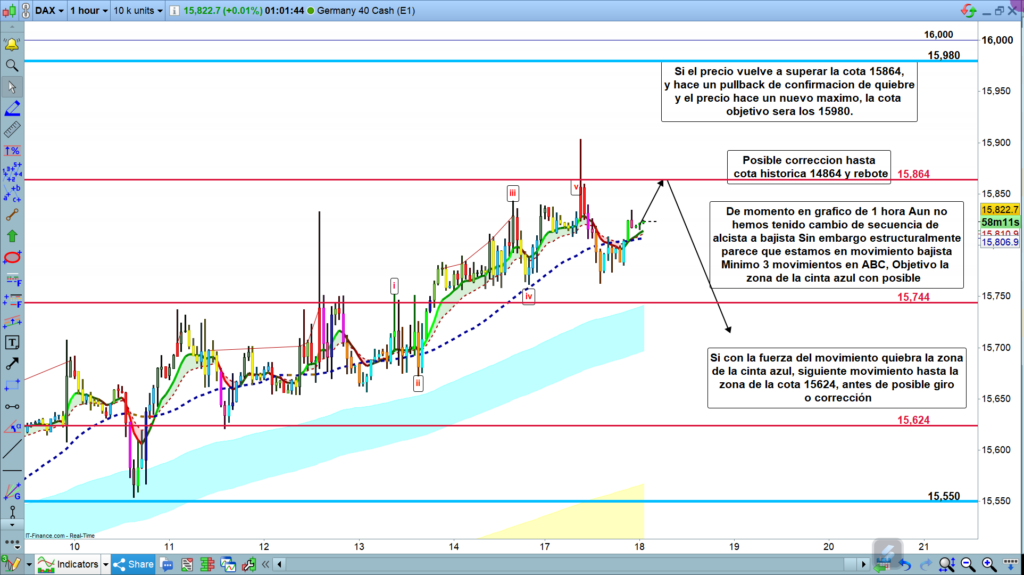 Si la bajada desde el alto de ayer en la zona ya de los quince mil novecientos hasta la zona de los quince mil setecientos sesenta fue solo el primer movimiento, lo normal es que ahora estemos en corrección con probable objetivo, de nuevo la cuota histórica 15864. Si es así, cuando llegue y testeé la cota tendremos un rebote para hacer un nuevo movimiento de impulso bajista con un mínimo de cinco ondas, primero objetivo la cinta de color azul. Si el precio llegara en este movimiento explicado hasta la zona de la cinta de color azul, y la quebrara, o sea la rompiera por abajo, muy probablemente el precio iría hasta la cota histórica 15624, antes de girar o de corregir de nuevo.
