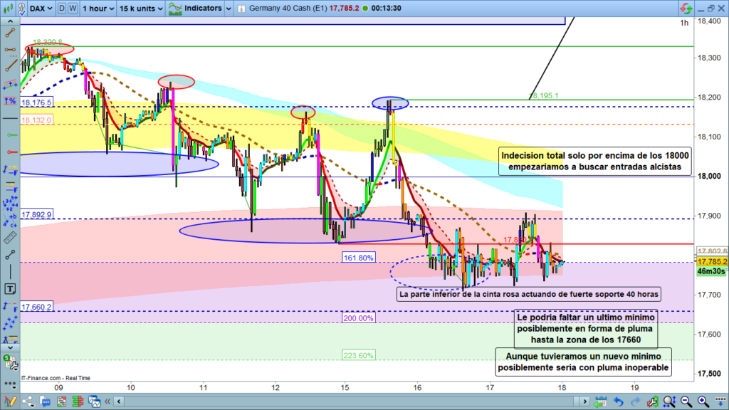 En gráfico de una hora del Dax 40, vemos como de nuevo ayer el precio se quedó en forma de lateral justo en la parte inferior de la cinta rosa de H1, ni acabó con pluma movimiento inferior ni llegó a atacar la zona de la genial de H4 que es lo que marca la frontera entre movimiento bajista y movimiento alcista en estos momentos. Para el día de hoy, la genial de H4, estará en la zona de los 17925 a 17935. Tan solo un claro quiebre confirmación de quiebre por encima de esta zona e incluso de la zona de los, 18000, es lo que abriría claramente a las puertas a un impulso alcista.