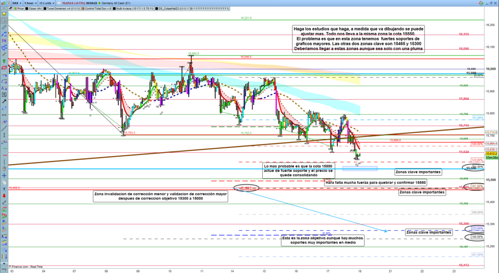Sin embargo, para el día de hoy tanto el Dax como algún otro activo están a punto de llegar a cotas históricas importantes, y esto me temo que dificulte en gran medida la posibilidad de recorridos. Centrándonos en el Dax ya hemos llegado, a estas horas de final del día y un poco antes del inicio de la sesión asiática, apenas a 40 puntos de la cota 15550, si no tuviéramos objetivos claros por la parte inferior podríamos pensar que en esta zona podría haber un importante rebote. Sin embargo, de momento las diferentes proyecciones en varias temporalidades marcan como zonas a alcanzar tanto la cota histórica diaria de los, 15465, como la otra cota histórica diaria de los, 15300.