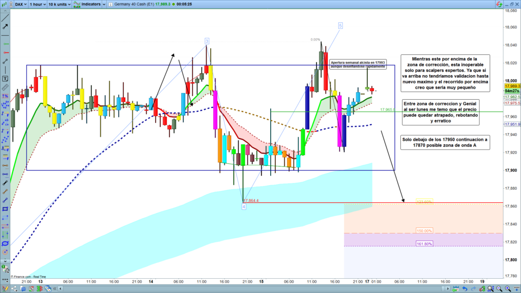 Por la parte inferior, lo primero que vamos a encontrar es la zona de corrección de gráfico de una hora, de 17982 a 17975, justo en la zona de los,17975, es donde empieza la zona de corrección de cuatro horas, hasta la zona de los, 17960, y en esta zona a final de asiática, muy posiblemente se encuentre la genial de H1. Por tanto, siendo lunes, si no hay ninguna sorpresa con los datos de IPC de la zona Euro, por desgracia lo más probable es que el precio se quede de forma errática en esta zona, sin poder acabar de quebrar y confirmar el quiebre de toda esta zona de soporte.