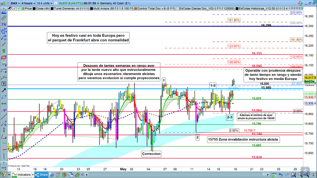 En gráfico de 4 horas del Dax 40, después de los movimientos de ayer, tanto el mínimo realizado al inicio de la vela de las 9 h, como posteriormente el nuevo alto realizado en la vela de las 19 h, que más tarde nos acabó dejando un alto en la zona de los, 16030, abren una nueva estructura claramente alcista. Sin embargo, al menos inicialmente, sobre todo el día de hoy, que es un día muy extraño, siendo festivo en más de media Europa, deberemos operar con precaución.