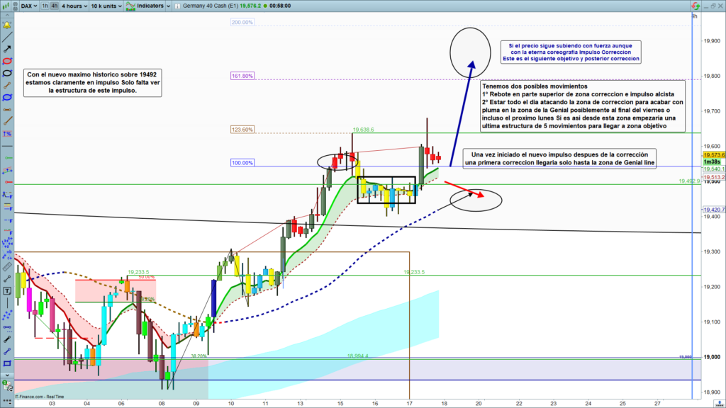Inicio del día, la zona de los, 19473, movimiento importante con la vela de las nueve horas que ha permitido conseguir una alta rentabilidad en el movimiento del día. A partir de la publicación de datos volatilidad, nuevo máximo histórico hasta la zona de los, 19681, vértigo de mercado por la zona tan alta en la que nos encontramos y vuelta atrás en dirección a la zona de corrección, zona objetivo en el corto plazo, 19540. Como veremos posteriormente en el análisis del día, zona que puede ser muy importante a la hora de determinar el nuevo movimiento del día.