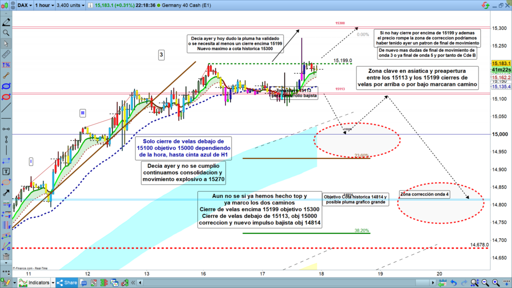 Ayer, cuando ya parecía que podríamos corregir, al menos ligeramente después de tantos días de recorrido alcista imparable, no pudo en ningún momento validar la perdida de la cota histórica 15113. con el cierre de dos velas consecutivas y progresivas de gráfico de 1 hora. Siguió consolidando en la cota histórica, hasta que a las 16 h, según parece fruto de un rumor de funcionarios de bajo rango del BCE, vela de alta volatilidad, como siempre lo mejor no creer en casualidades, es muy extraño que precisamente el rumor llegue a los mercados a las 16 h en punto. Esta volatilidad, sobrepaso la zona del último máximo en los 15198, proyectando el movimiento hacia la cota 15300, sin embargo, se quedó sin fuelle, se quedó a 28 puntos de la cota, estos detalles no suelen ser menores y será importante en las proyecciones del precio del día de hoy.