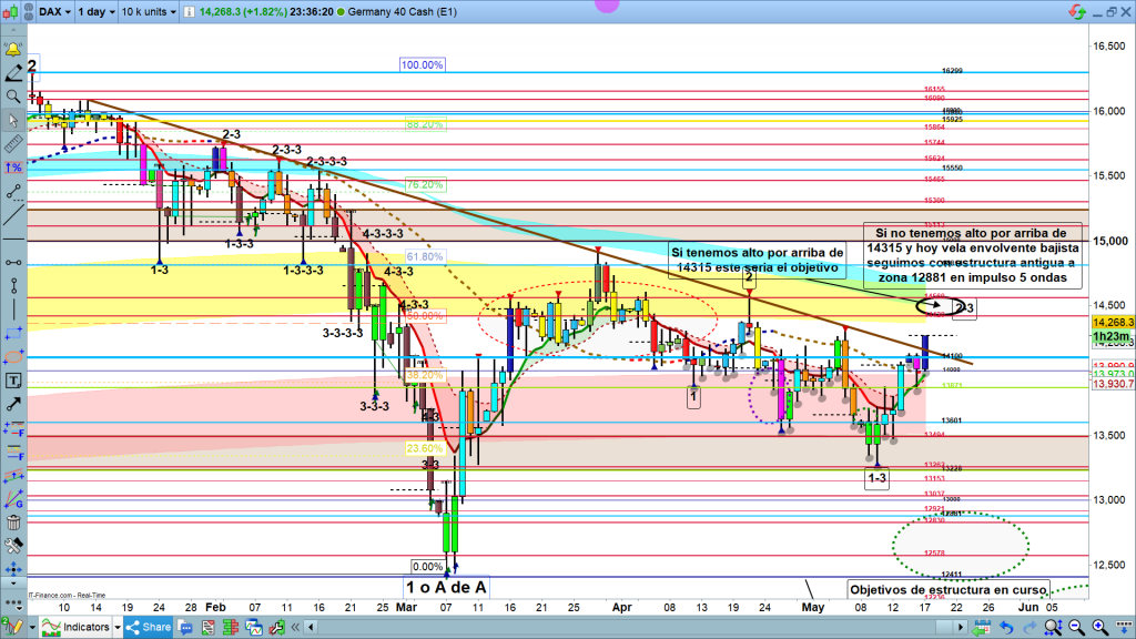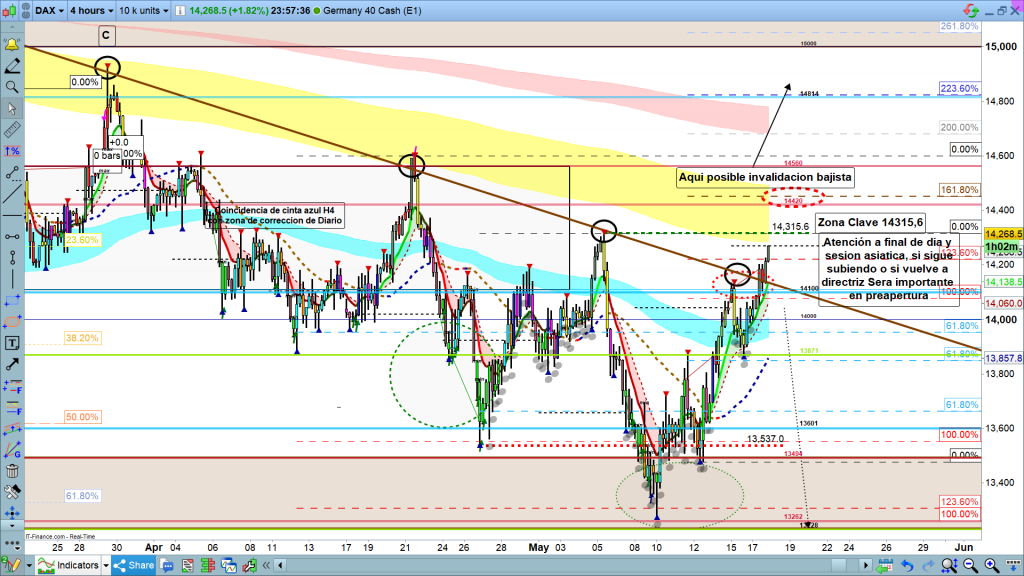Las claves, inicio del día, en inicio de sesión asiática a las 01 h, en caso de posible vela envolvente, justo a partir de la 01 h, no deberíamos tener nuevo máximo, y las diferentes validaciones durante el día de hoy a base de ir quebrando soportes. Por el lado contrario, un máximo encima de los, 14315, convencería a los inversores de cambio del dibujo de la estructura y aceleración del movimiento en búsqueda de los, 14420. Muchísima suerte y muy buenos trades