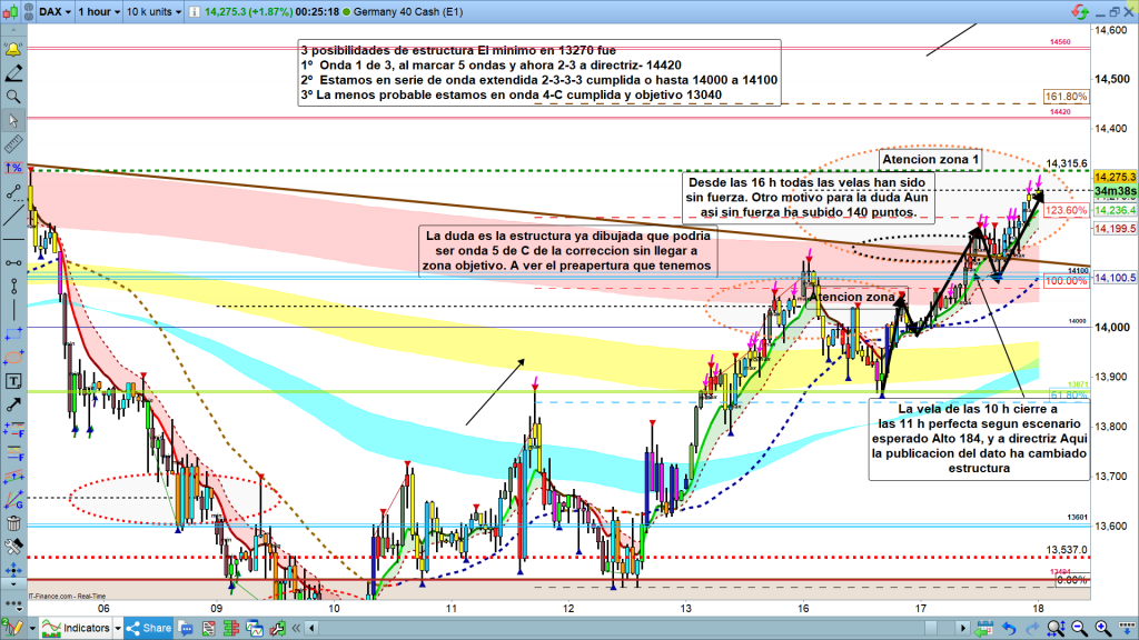 En gráfico de diario del dax40, imagen clara de la situación. Después de 5 meses, podríamos tener quiebre de la directriz, o no. La zona clave, 14315,5, si la supera la zona objetivo más probable será la cota histórica de los, 14420. Sin embargo, si no tuviéramos este nuevo alto sobre los 14315, y además la vela de hoy fuera envolvente bajista, cerrando mañana a las 01 h, CET, por debajo de los 14000, aquí no habrá pasado nada. Los mercados son así, como veremos en gráfico más pequeño, el precio del dax40, había llegado milimetricamente hasta los, 14184, y había vuelto a la directriz. A las 11 h, en punto, estaba sobre la directriz. Con el dato macro, empezó una situación de titubeo, que al final parece que se resolvió en rally alcista por encima de la directriz.