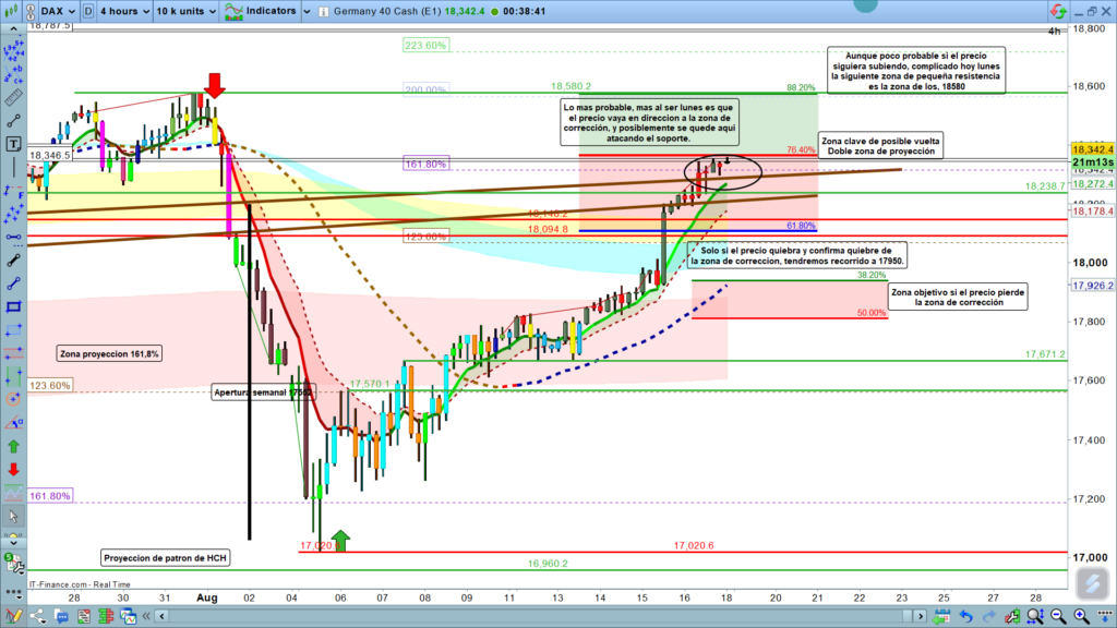 En principio, siempre es un tema de probabilidades, pero teniendo en cuenta las circunstancias, que el precio ha llegado a la proyección de la extensión de 161,8%, zona que coincide con el retroceso del 76,4%. Al ser hoy lunes, creo que lo más probable, podría ser que el precio se quedara entre la zona actual y la zona de corrección de gráfico de 4 horas. O sea, apoyándose sobre la amplia zona de soporte de los 18300 a 18200.