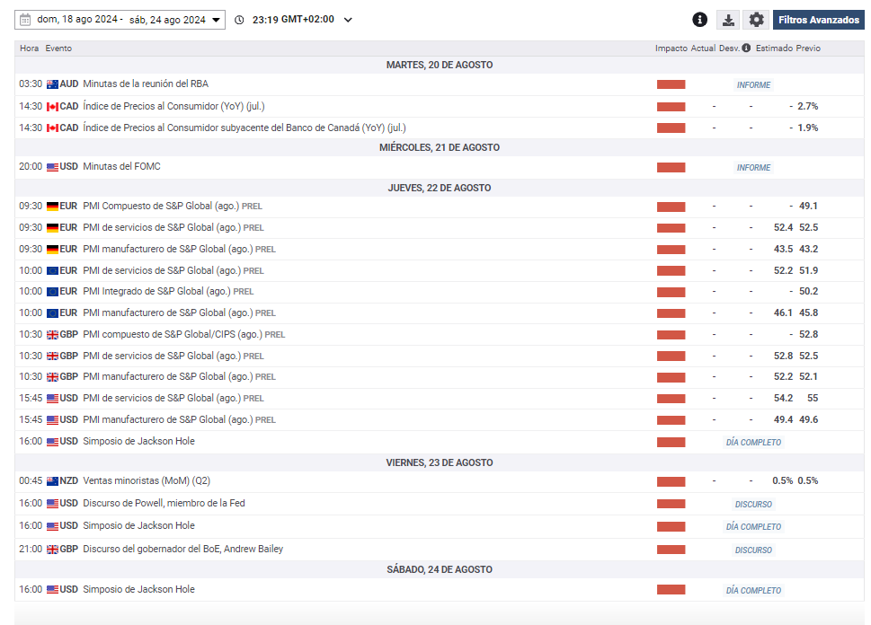 Publicado lunes 19 de agosto de 2024, a las 00 h UTC. Las horas del Calendario Económico, son UTC+2.