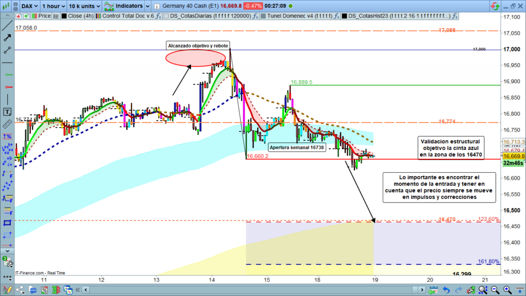 En gráfico de una hora del Dax 40, vemos que en la situación estructural es muy clara, por un lado, quebrada y confirmado el quiebre de la cinta azul, el objetivo es la parte superior de la cinta amarilla. Por otro lado, a nivel estructural, después del movimiento realizado desde máximos hasta la zona de los, 16660, y posterior corrección hasta los, 16889, al realizar un nuevo mínimo por debajo del mínimo anterior, tenemos ya una clara validación estructural que nos proyecta como mínimo hasta la zona de los, 16470.