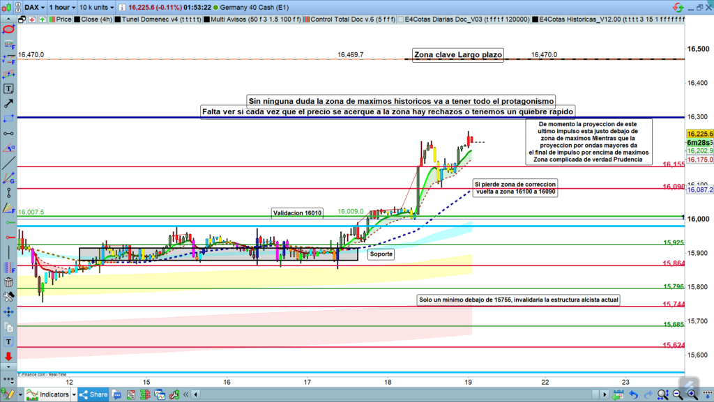 Por tanto, en el día de hoy, pienso que lo más probable sean ataques y posteriores rebotes a la zona de máximo histórico, a no ser que en un momento de amplia volatilidad, como podrían ser la apertura de alguno de los parquets, tengamos un claro quiebre de la zona de los 16299, aunque posteriormente lo más probable es que tuviéramos una nueva corrección como mínimo hasta la zona de los,16100 a 16090.