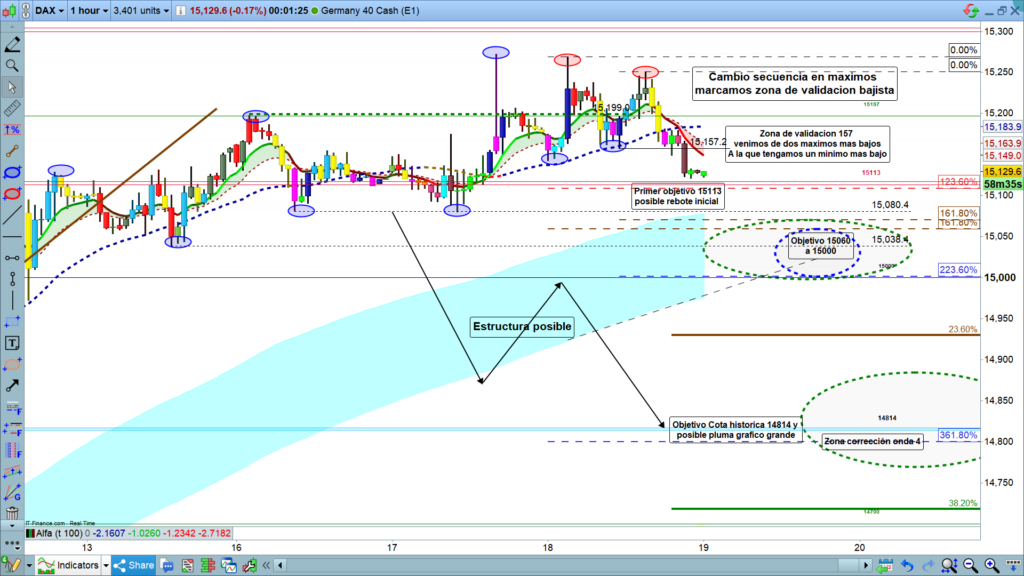 En gráfico de 1 hora del dax40, vemos lo acaecido y, por tanto, en principio proyectado. veamos ayer, por fin tuvimos cambio de secuencia de máximos, al principio y después de validación a las 19 h, también de mínimos, pasando de máximos y mínimos más altos a máximos y mínimos más bajos. Veremos si esta estructura se queda aquí en corrección ya finalizada, cuando testee los 15113 o los 15080, o si, por el contrario, según lo que esperamos es una corrección más importante y este movimiento actual es solo el primero de una estructura correctiva, sencilla como pauta plana o compleja con figura o doble zigzag.
