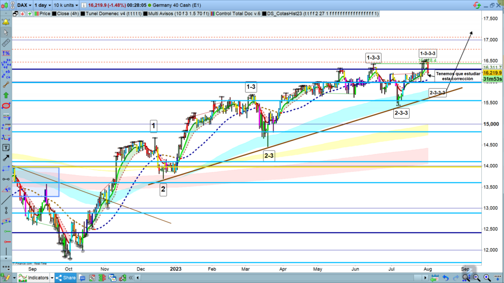En gráfico diario del Dax40, vemos cuál es la estructura más probable en la que estemos ahora y, por tanto, que estructura debemos esperar de la corrección en curso. Por prudencia, los estudios catalogados como más probables son los de estar solo en corrección de onda 2-3-3-3, o sea corregir solo el movimiento desde los 15455 hasta el máximo histórico en los 16532. La zona objetivo esperable será la zona de los 15864 a 15744.