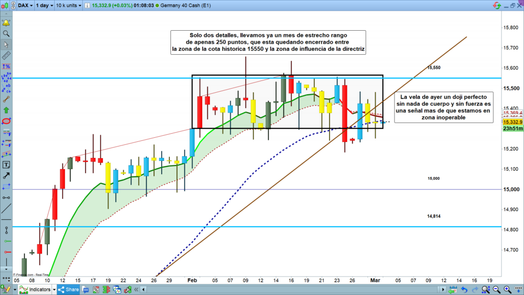 Como ejemplo solo hay que ver la vela de ayer, un doji de indecisión total, en medio del rango, con plumas de cierta entidad, pero sin nada de cuerpo, apertura del día en 15332, cierre del día en 15331.