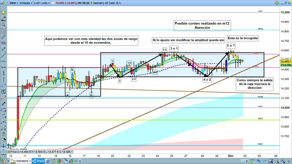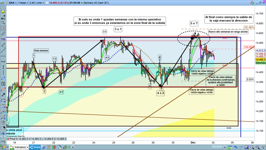 En gráfico de 4 horas del dax40, imagen bastante clara, la salida de la caja por la parte superior, nos llevaría a más días y posiblemente semanas con el mismo escenario. La salida de la caja por la parte de abajo, sería el inicio de movimiento bajista más importante, onda 1 de nueva estructura, posible objetivo la zona de los 13228, zona de validación para operativa de intradia a partir de perder los 14100.