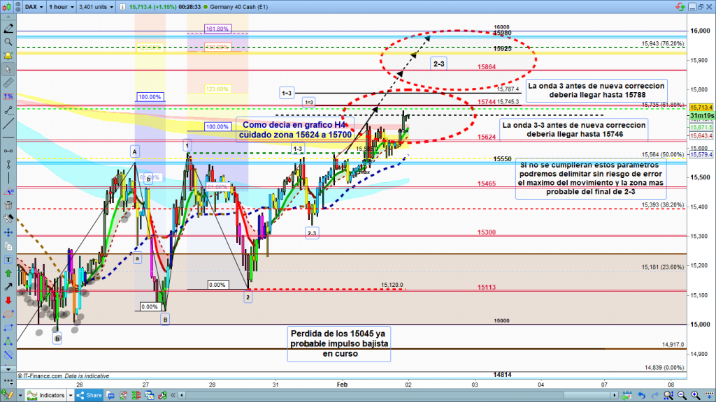 Veamos las zonas, la onda 3-3 debería hacer un alto por encima de 15746, antes de finalizar y hacer nueva corrección. Luego 4-3 corrección bajista, y último impulso para acabar onda 3. Esta debería ser por encima de 15788. En el caso de que fuera así y la onda 3 de C fuera aunque sea por un punto superior a onda 1, la onda 5 puede ser grande, de más del 100% de 1 o de 3. En el caso de que no finalice la onda 3 por encima de los 15788. Deberemos esperar el final de la corrección de onda 4, y desde allí dibujar el recorrido de la onda 3, y el punto que de no será sobrepasado, cerca, pero antes de llegar a este punto deberá finalizar el recorrido de la corrección en curso onda 2-3. Empezando la onda importante onda 3-3 de diario bajista con objetivos en la zona ya explicada 14000, 13871, 13601, 13480 a 13200. Muchísima suerte y muy buenos trades.
