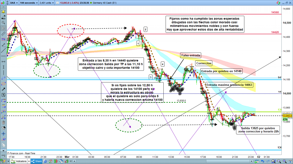 Antes de ver la evolución esperada para hoy, vamos a ver algunos detalles técnicos que espero os sirvan de ayuda cuando estéis delante del gráfico y tengáis que tomar las decisiones de entrar o no entrar. Fijaros que antes de las 13 h ha habido un quiebre de la cota 14100. sin embargo, si miramos el impulso anterior, vemos que justo antes del quiebre hemos tenido final de onda 3, onda 4, y, por tanto, falta onda 5, podría bajar más o menos dependiendo de la fuerza y la hora. En aquella hora, no había mucha fuerza, pero lo claro es que la siguiente corrección sería más importante que la anterior, muy probablemente por encima de 14100, como así fue o al menos testearía de nuevo la cota 14100. Ese sería el momento de buscar la entrada de nuevo. Estos detalles con la experiencia, ayudan mucho a que el porcentaje de trades positivos sea cada vez más alto. La historia de lo ocurrido ayer, la tenéis perfectamente dibujada en el gráfico. movimientos perfectos y nobles hasta las zonas marcadas ayer.