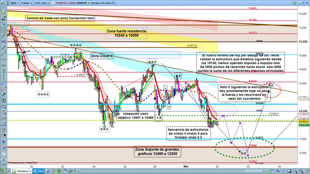 Para hoy en principio, acabados los impulsos más importantes, estamos en secuencia de ondas 4 y ondas 5, para acabar la onda 3-3. Primer impulso buscando los 13601 a 13480, nueva corrección y último impulso zona probable dependiendo de fuerza y hora en que esté en la zona, 13330 a la cota 13262. Una vez acabada la onda 3-3, la siguiente corrección de la onda 4-3, hasta la zona 14330 aproximadamente, con posible pluma hasta la cota 14420. La verdad en esta zona es más fácil ver el gráfico que estar explicando las zonas clave más probables de posibles giros. Muchísima suerte y muy buenos trades.