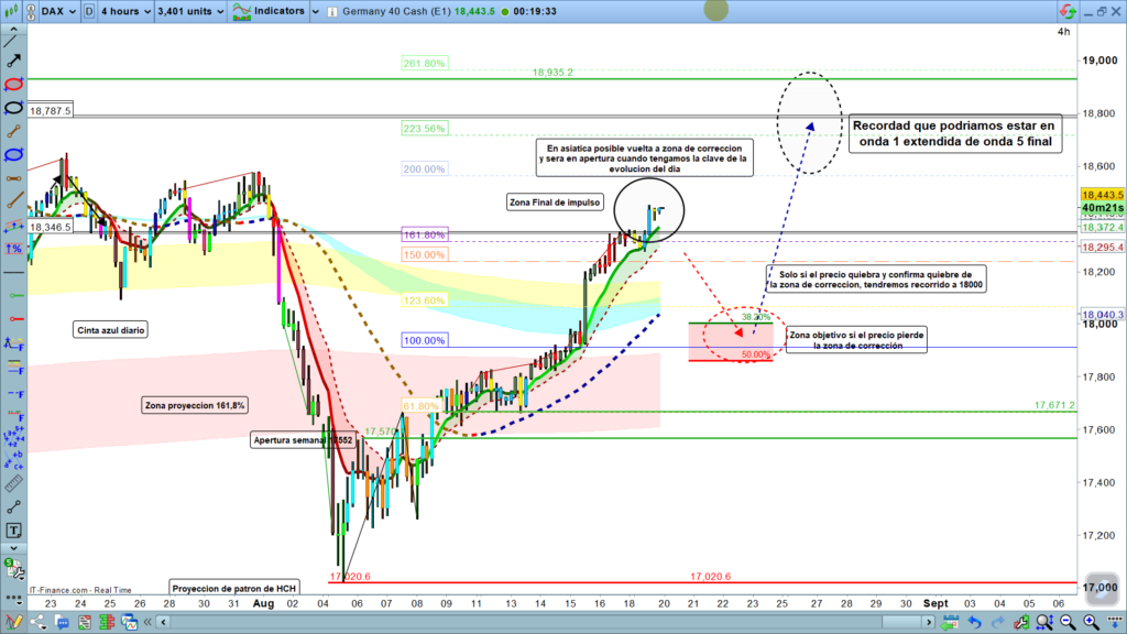 Análisis diario Dax, tipo flash corto, lectura de 2 a 4 minutos, con las claves del día. Ondas de Elliot, estructuras de precio, zonas clave y objetivos.
