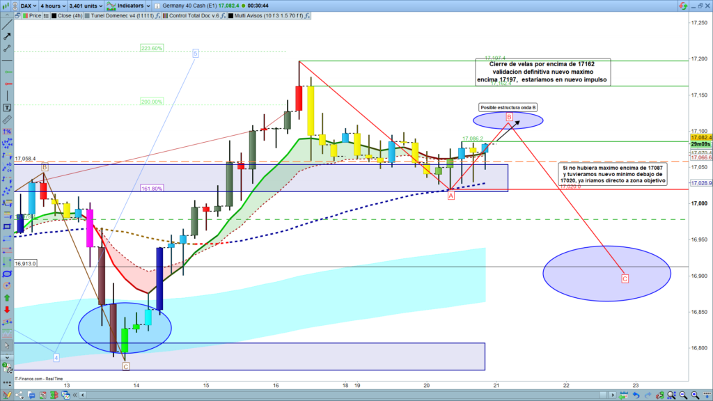 Todo depende como de que esta teórica evolución alcista sea solo una onda B correctiva antes de seguir bajando con más fuerza en busca de las zonas objetivo marcadas. En el caso de que el precio superará la zona de los, 17160, o sobre todo con un nuevo máximo histórico por encima de los, 17197, sería obvio que estaríamos en un nuevo impulso y que deberíamos de medir los diferentes movimientos realizados hasta esta zona para determinar con más claridad la posible zona final. Muchísima suerte y muy buenos trades.