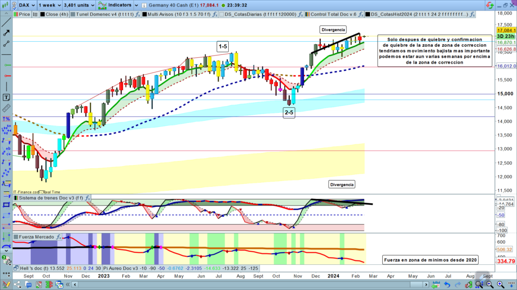 Hoy podéis ver que hay un estudio completamente detallado, desde gráficos semanal hasta gráfico de una hora. De esta forma podemos empezar a tener una idea de cuál va a ser la situación a medio plazo, aunque tengamos divergencias claras, la de semanal pueden pasar todavía varias semanas antes de que esta divergencia se active, la del gráfico diario, podría ser el movimiento correctivo esperado para el corto plazo.