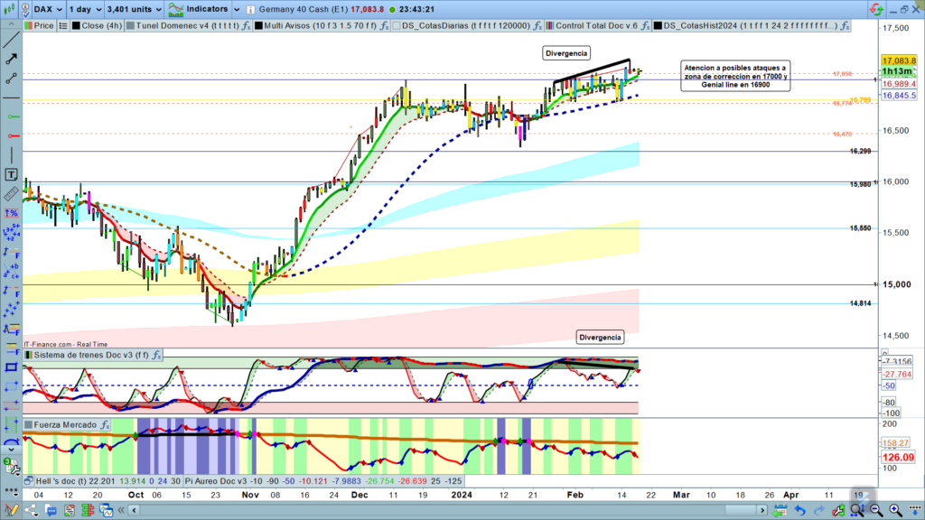 Ayer, día completamente neutro durante toda la mañana el precio estuvo atacando un soporte sin apenas moverse en la zona de los, 17060, luego por la tarde lo intentó levemente por arriba, la zona de Jenny al line en los, 17090. La apertura semanal había sido en la zona de los,17085, y el cierre del día en la zona de los 17088, como podéis ver completamente neutro, apenas 3 puntos de diferencia durante todo un día 24 horas.