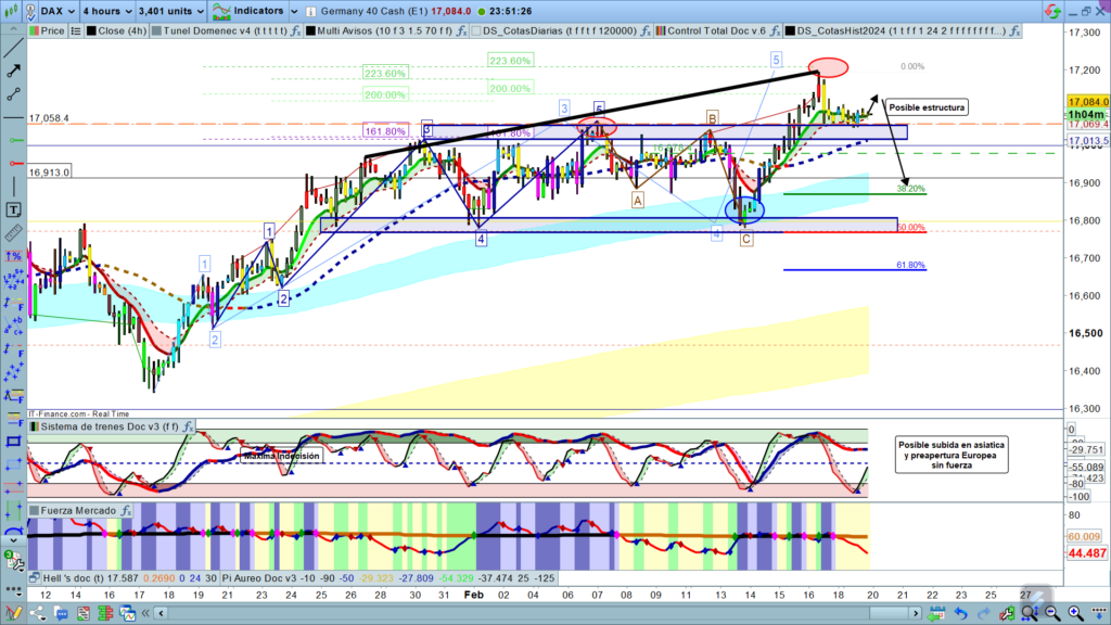 Análisis diario Dax, tipo flash corto, lectura de 2 a 4 minutos, con las claves del día. Ondas de Elliot, estructuras de precio, zonas clave y objetivos.