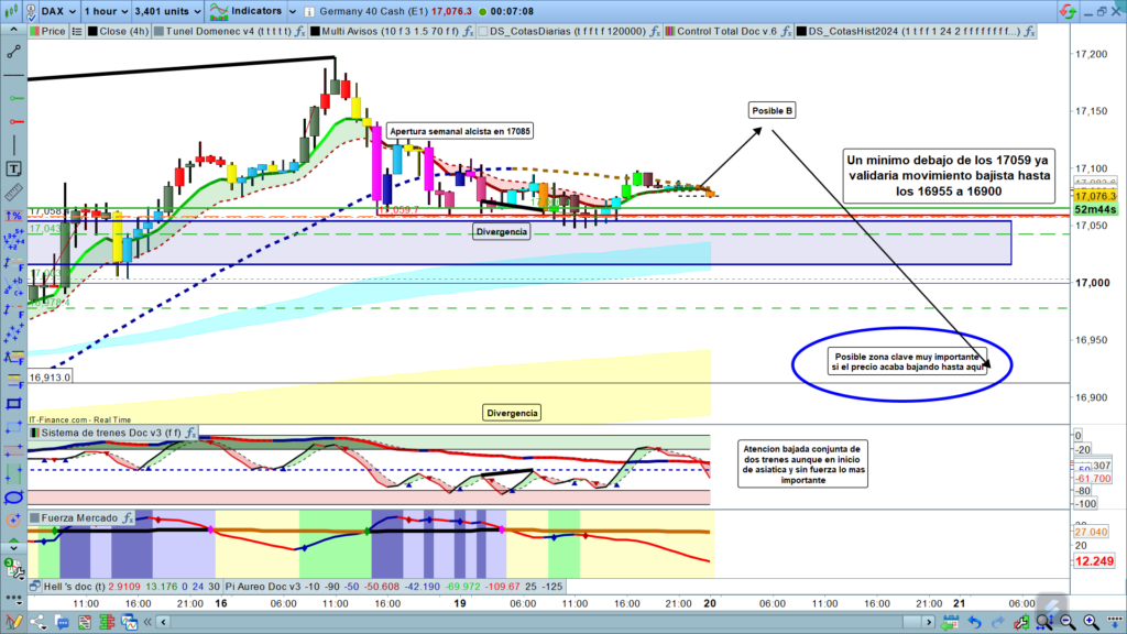En gráfico de 4 horas y de una hora, para ver cuál es la situación y posible proyección para el corto plazo, esto va a depender de cuáles son los movimientos durante la sesión asiática y sobre todo durante la preapertura de la sesión Europea. Parece que el movimiento más lógico podría ser un primer tramo alcista aproximadamente hasta la zona de los, 17130 a 17140, si en esta zona tuviéramos un giro de mercado, empezaríamos un claro impulso bajista hasta la zona de los, 16955 a 16900 aproximadamente.