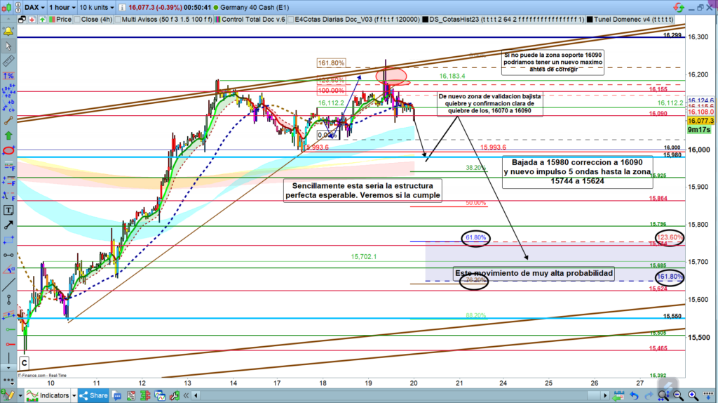 En gráfico de una hora del Dax40, Como vemos como la estructura en curso parece hasta demasiado evidente, sólo necesitamos la validación con un quiebre y confirmación de quiebre de la zona de los, 16090 a 16060, si este se produce, entonces las probabilidades de que el precio cumpla la estructura dibujada serán muy altas.