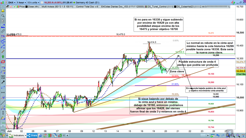 En el caso de que el precio, después de llegar y testear esta zona, se diera de nuevo la vuelta y perdiera la cota de los, 16299, lo más probable es que estaríamos en un movimiento de Honda C con cinco movimientos u ondas. Cuyo objetivo sería la zona de la cota de los,16090, más pequeño espacio por debajo, concretamente hasta la cinta amarilla del gráfico de una hora. Después de esta corrección, lo más probable sería un nuevo impulso, para acabar con bastantes probabilidades, entre la zona de los, 16428, ya alcanzada el pasado viernes, y la zona de los,16470, por debajo de la niña tan importante de los, 16475. Esta zona posiblemente sería la zona final del movimiento.