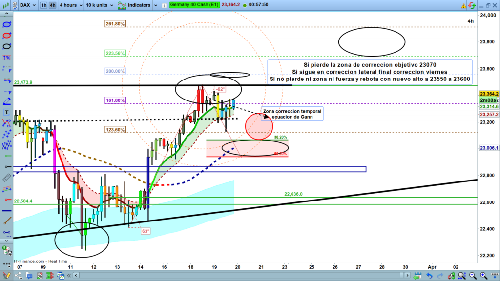 - Si el DAX no pierde la zona de soporte actual y muestra fuerza, podría rebotar desde la zona de 23.257 – 23.314 y buscar nuevos máximos en 23.550 – 23.600.