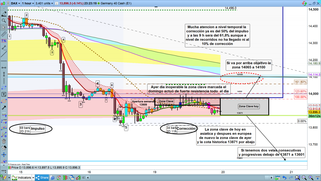 En gráfico de 1 hora del dax40, vemos la zona operable tanto de ayer, como la esperada para hoy, dependiendo por donde rompa la nueva zona clave.