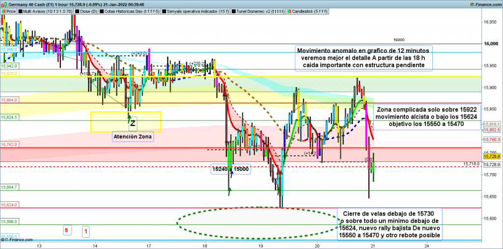 Para hoy, más siendo viernes, la operativa podría ser complicada. Por la parte inferior, con un mínimo por debajo de los 15624, lo primero que nos encontramos es la zona 15550 a 15470, ya conocida como fuerte soporte. Solo un movimiento prolongado de mucha fuerza lo rompería de primeras, lo más lógico es que al primer ataque a la zona tengamos nuevo rebote.