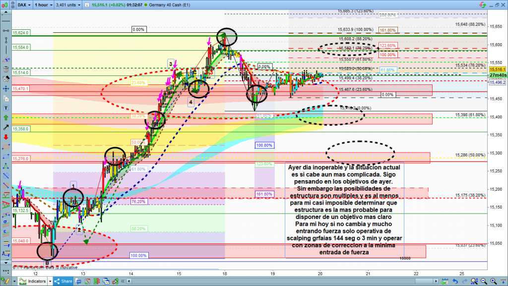 Ayer día para olvidar. Esperaba el movimiento bajista buscando la zona de objetivos, parecía que el cierre de la vela de las 10 en 15470, podía dar una entrada interesante, puse orden a las 11h en 15460, a cortos y ahí se quedó sin activarse durante todo el día. Solo hay que ver el gráfico con la evolución de esta semana, para entender que de momento y hasta la entrada de fuerza lo mejor es estar fuera del mercado.