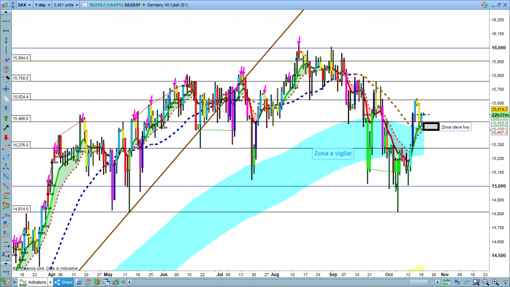 Un mínimo debajo de los 15417, objetivos 15358, y muy posiblemente la zona 15300 a 15276, con quizás alguna pluma rápida por debajo. Mientras sigamos por encima de la zona de corrección de 1 hora, el objetivo más probable son los 15570 a 15585. En esta zona mucha precaución, ya que ahí sí que el precio empezaría a enseñar un poco más la estructura real. La clave la entrada de fuerza, cada uno que utilice los indicadores u osciladores, o incluso la forma de las velas para determinar la posible entrada de fuerza. Quien utilice el indicador Control total, con sus velas de colores, la aparición de velas verde oscuro con velas rojas en corrección, marcarían la entrada de fuerza alcista.