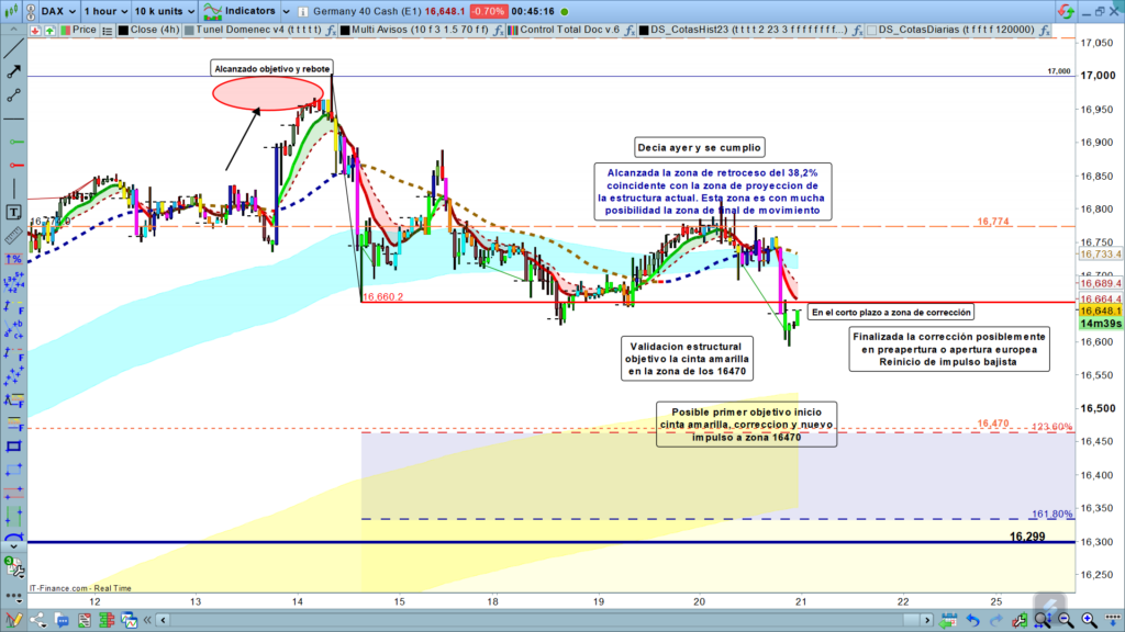 Estamos en estructura bajista nuevamente confirmada en el día de ayer, por tanto, una vez finalizada la actual corrección, deberemos buscar el reinicio de impulso bajista con primer objetivo la parte superior de la cinta azul. Aproximadamente en la zona de los, 16525, Si el precio alcanza esta zona de nuevo a zona de corrección de H1, y una vez finalizada el movimiento de nuevo impulso ya hasta la zona objetivo, 15470 hasta 15400.