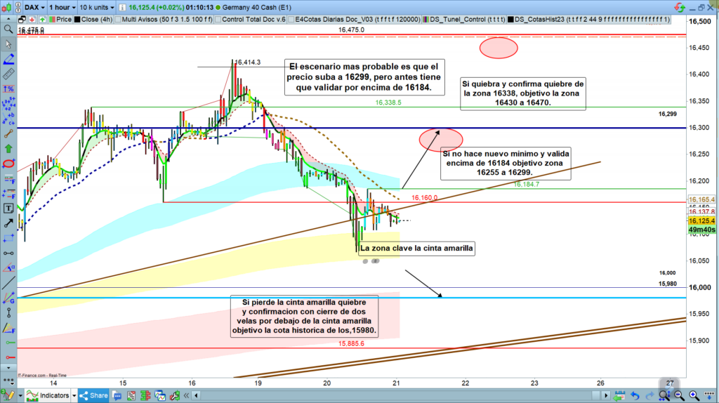 Sin embargo, para ello tiene que romper varias resistencias, la misma zona de corrección, la directriz, la genial line de gráfico de una hora, y hacer una validación, o sea un alto, aunque fuera por un solo punto por encima de la zona de los, 16184. Este alto, lo tenemos que hacer sin realizar antes un nuevo mínimo, la zona objetivo esperada, en el caso de tener esta validación, es la zona entre los, 16256 y los, 16299, de la cota histórica muy importante. En este caso, lo más probable es que llegue a testear como mínimo la cota histórica.