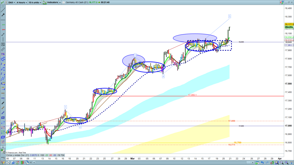 Ayer, el precio lo volvió a hacer, onda sin llegar a la zona de retroceso esperada, ni siquiera finalización por temporalidad, según ecuación de Gann. Los nuevos datos en forma de proyecciones de tipos de interés a medio largo plazo, un auténtico brindis al sol sin ningún tipo de base provocaron una rápida salida de nuevo impulso, dejando la corrección a medias. Nos estuvimos moviendo dentro del rectángulo o caja en el que estábamos situados desde el pasado 12 de marzo, y justo a las 19 horas, con la publicación de estos nuevos pseudo datos el precio salió en impulso alcista rompiendo la zona de la caja haciendo nuevo máximo y cerrando el día con la onda 3-5 ya muy adelantada, en la zona de los 18175. Ninguna sorpresa en cuanto al nuevo impulso, la sorpresa relativa ya a estas alturas, fue que este impulso empezara antes de finalizar de forma más clara la corrección en curso. Llevamos unos cuantos meses que todas las correcciones de onda cuatro acaban claramente en situación de lateral, aunque la mayoría de ellas han respetado hasta ahora la ecuación de temporalidad de Gann, no fue así lo que ocurrió durante el día de ayer, ni retroceso mínimo a la zona esperada ni cumplió el mínimo de temporalidad en el lateral.