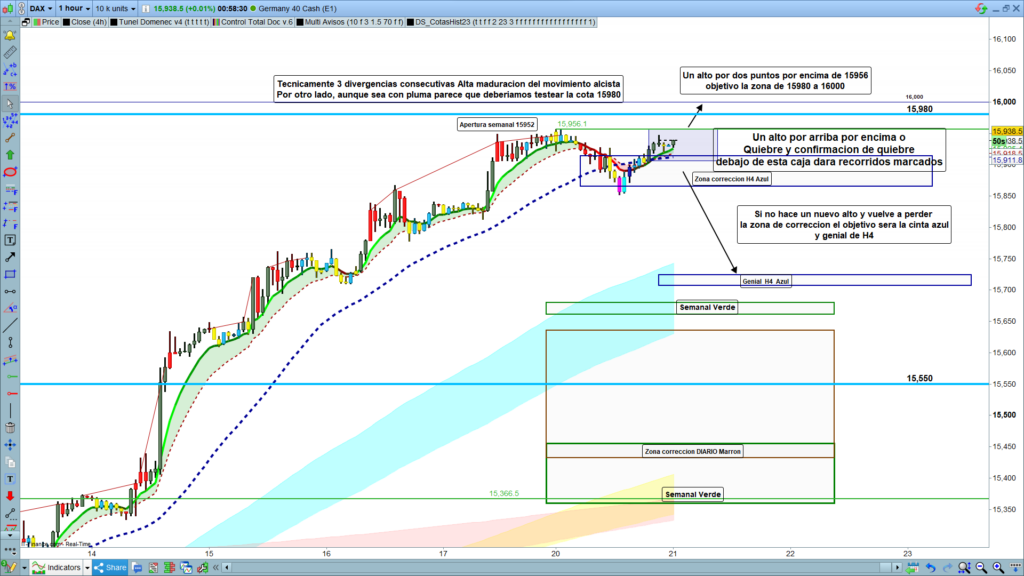 En el caso de que el precio haga un alto por encima de los, 15956, el objetivo es claro la zona de la cota histórica importante en los, 15980 hasta la zona de los, 16000. En el caso de que esta sea la opción que escoja el precio para el día de hoy, muy probablemente, en esta zona el precio se quede consolidando bastantes horas. Solo en el caso de que haga solo testeo a la cota histórica en los,15980, y tengamos un claro rebote, en este caso sí que podríamos tener un movimiento bajista bastante acelerado.