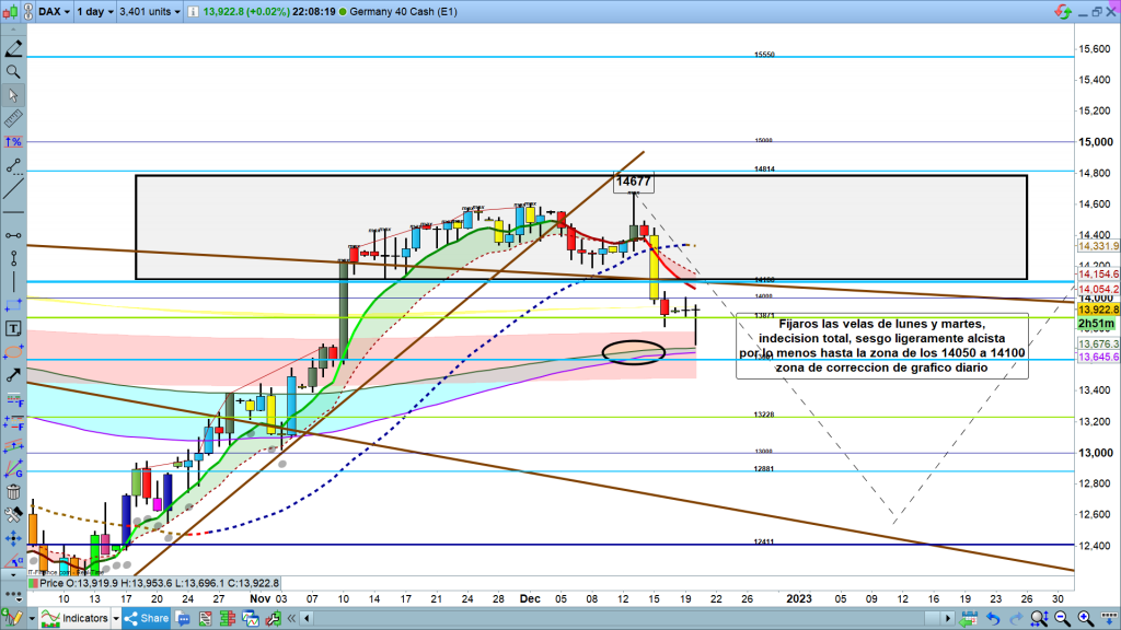 Ayer por segundo día esta semana, el dax inoperable, a las 9 h llego a la zona de la Genial del gráfico de 1 hora y el resto del día, se estuvo moviendo en un mínimo rango de, aproximadamente, 30 puntos, entre la Genial y la zona de corrección de gráfico de 1 hora, esta última coincidía además con la cota histórica importante del 13871. Solo cuando ya había cerrado el parquet de Frankfurt, el precio como ayer consiguió romper la zona de resistencia (ayer fue la de soporte), y moverse hasta el cierre de Wall Street, unos 40 a 50, puntos por encima de la Genial line, pero con velas sin fuerza la mayoría dojis en H1.